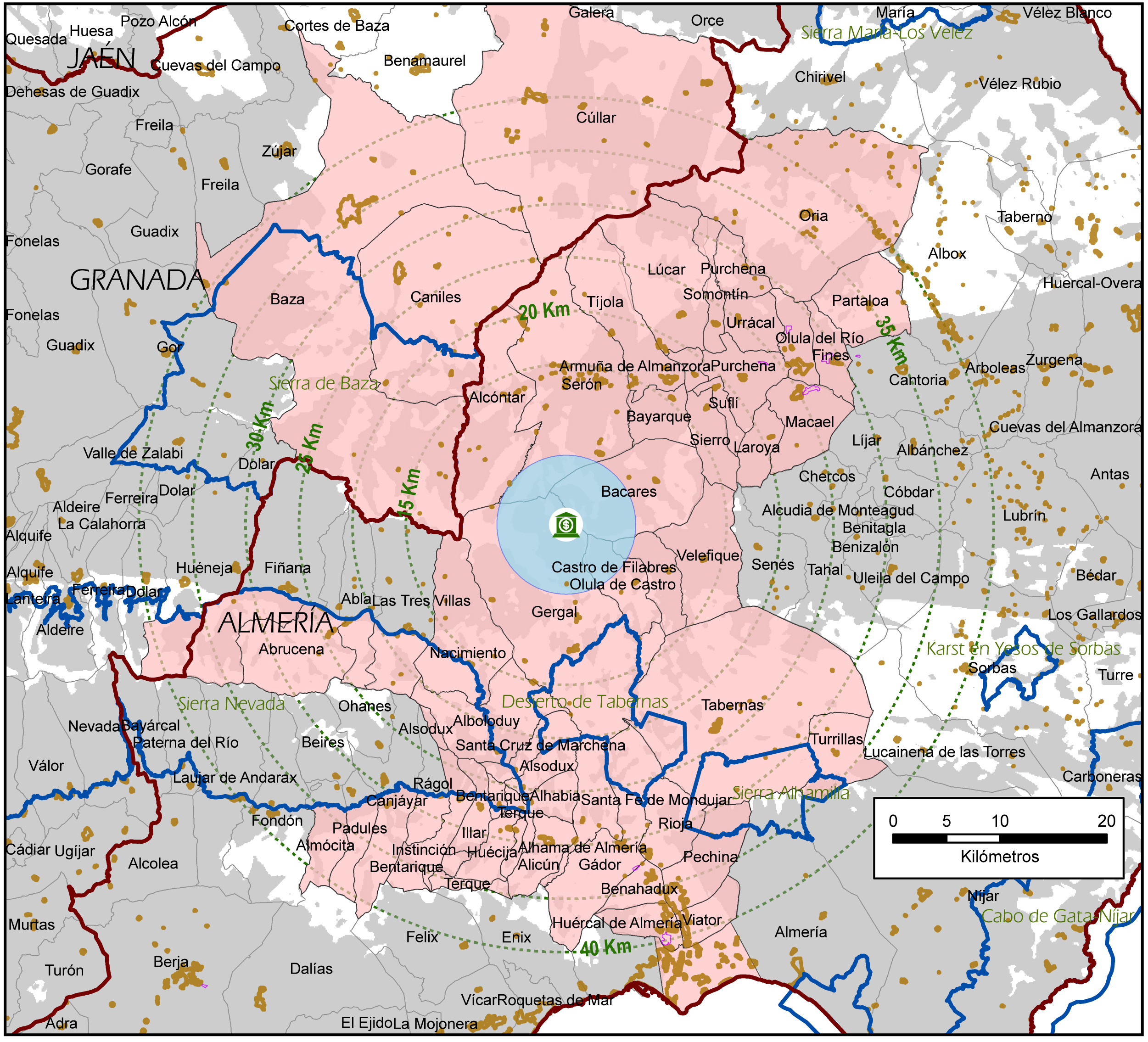 Mapa con la delimitación de la zona de influencia del Observatorio de Calar Alto para la protección de su cielo frente a la contaminación lumínica: áreas Z1 (azul) y Z2 (rosa). (3.2 MB)