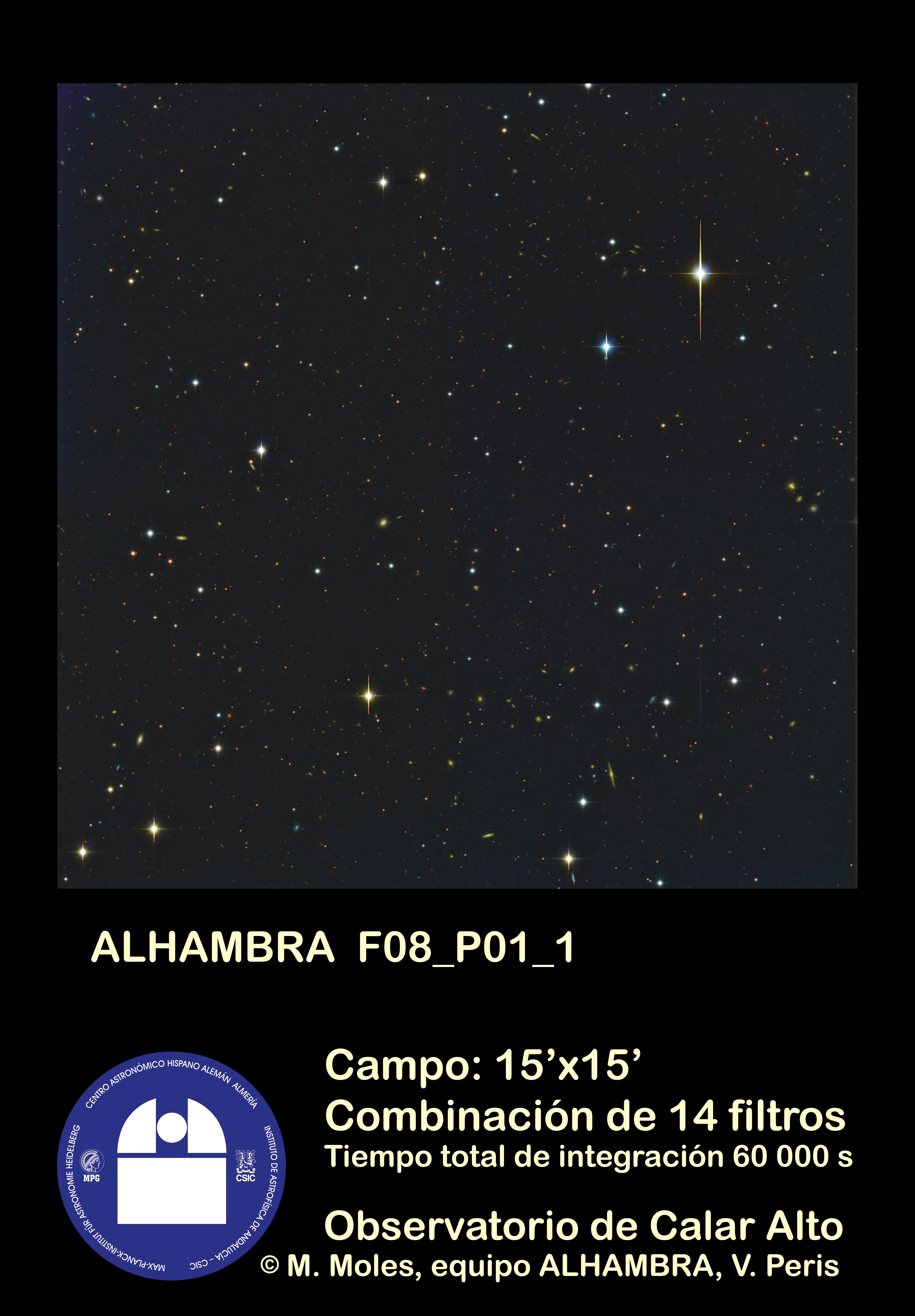 Completados los primeros campos, las imágenes del proyecto ALHAMBRA obtenidas con el telescopio de 3.5 m. de Calar Alto revelan la potencia espectacular de este sondeo para su objetivo científico central, estudiar la evolución cósmica. La imagen que acompaña esta nota corresponde a una región de 15 minutos de lado (1/3 del área de la Luna llena), de uno de los campos observados con la cámara LAICA. En esta imagen aparecen alrededor de 10 000 objetos. La mayoría de ellos son galaxias remotas, pero también hay cuásares, galaxias activas, estrellas de nuestra propia Galaxia situadas en primer plano, e incluso objetos del Sistema Solar (asteroides y quizá objetos transneptunianos).