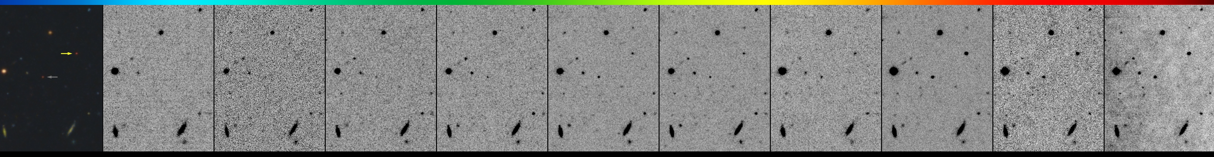 Esta figura muestra una pequeña porción de la primera imagen publicada de ALHAMBRA. Se representa en color (izquierda) y a través de algunos de los 23 filtros (colores) de ALHAMBRA. En particular, las diez imágenes mostradas corresponden, de izquierda a derecha, a los filtros con longitud de onda central entre 520 y 799 nm. Se puede comprobar cómo las dos galaxias más rojas (marcadas con flechas) aparecen solo en las imágenes tomadas con los filtros de longitud de onda más larga.