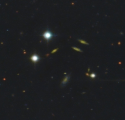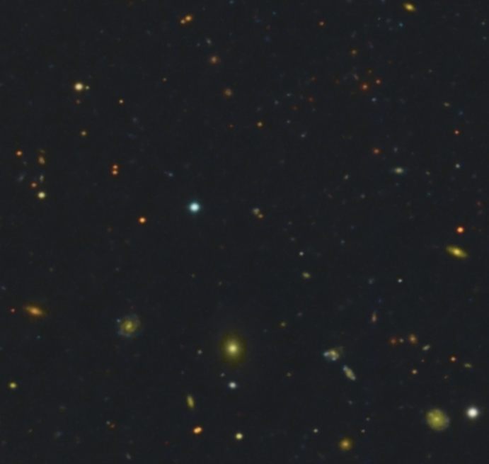 En la figura anterior se muestran ampliaciones de la imagen original que permiten intuir la cantidad y diversidad de objetos extragalácticos detectados, algunos 100 millones de veces más débiles que las estrellas más tenues que pueden percibirse a simple vista. Al disponer de datos en 23 filtros diferentes será posible además caracterizarlos y determinar la distancia de muchos de ellos. Esta medida se obtiene con una precisión sin precedentes en un proyecto que utiliza solo imágenes, sin recurrir a espectros.