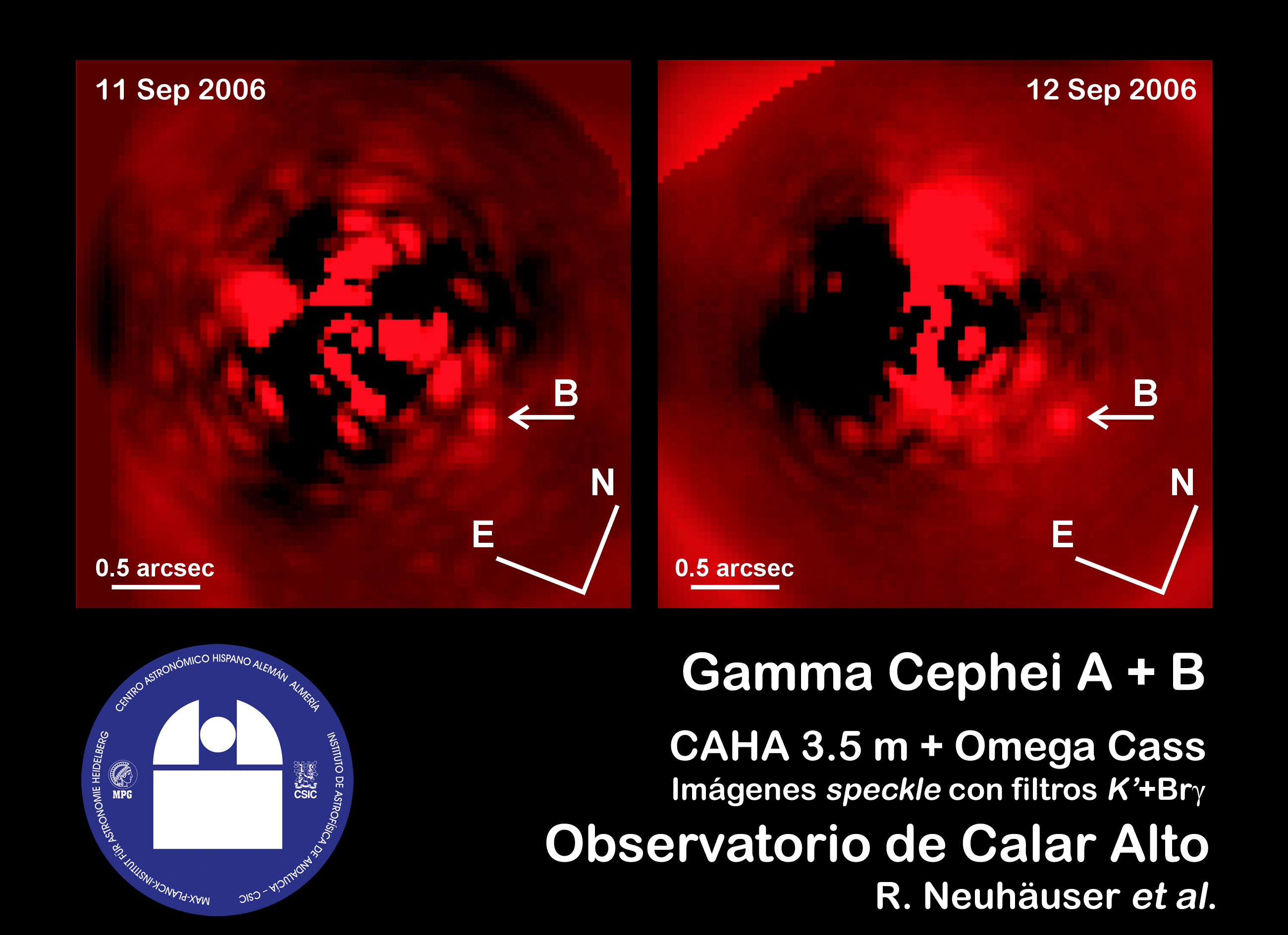 Observaciones de gamma Cephei A+B con Omega-Cass (425 Kb) Imágenes infrarrojas del sistema de gamma Cephei, obtenidas desde Calar Alto el 11 de setiembre (izquierda) y el 12 de setiembre de 2006. La componente más brillante, A, ocuparía el centro de ambas fotografías pero se ha eliminado por medios digitales con el fin de revelar la ubicación de la componente débil, B, señalada con una flecha.