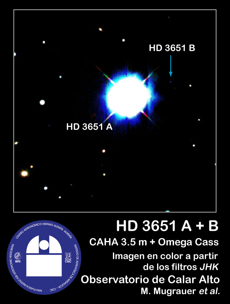 El mismo equipo ha realizado otro hallazgo destacado en el que han intervenido los telescoios de Calar Alto: el de la estrella que acompaña a HD 3651. La estrella HD 3651 es un astro cercano, rojizo y débil, que se sabía acompañado por un planeta de masa inferior a la de Saturno. El equipo de Jena ha descubierto otro objeto muy débil que también forma parte del sistema, y acaba de demostrar que en realidad se trata de una enana marrón fría, la primera enana marrón que acompaña a una estrella con planetas y de la que se han obtenido imágenes directas. Las observaciones que se efectuaron con el instrumento Omega-Cass acoplado al telescopio de 3.5 m en setiembre de 2006 sirvieron para demostrar que existe un vínculo físico real entre la estrella principal HD 3651 y este pequeño objeto subestelar (ahora denominado HD 3651 B). Asimismo, los datos condujeron a determinar las características físicas de la enana marrón. Esta débil compañera de la estrella HD 3651 y de su planeta, ha resultado ser una de las enanas marrones más frías conocidas (temperatura efectiva entre 500 y 600 grados centígrados).