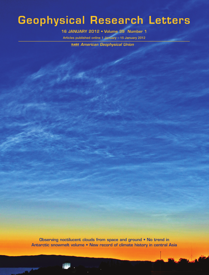 Cubierta del núero de enero de 2012 de la revista Geophysical Research Letters que muestra una imagen muy llamativa de nubes noctilucentes