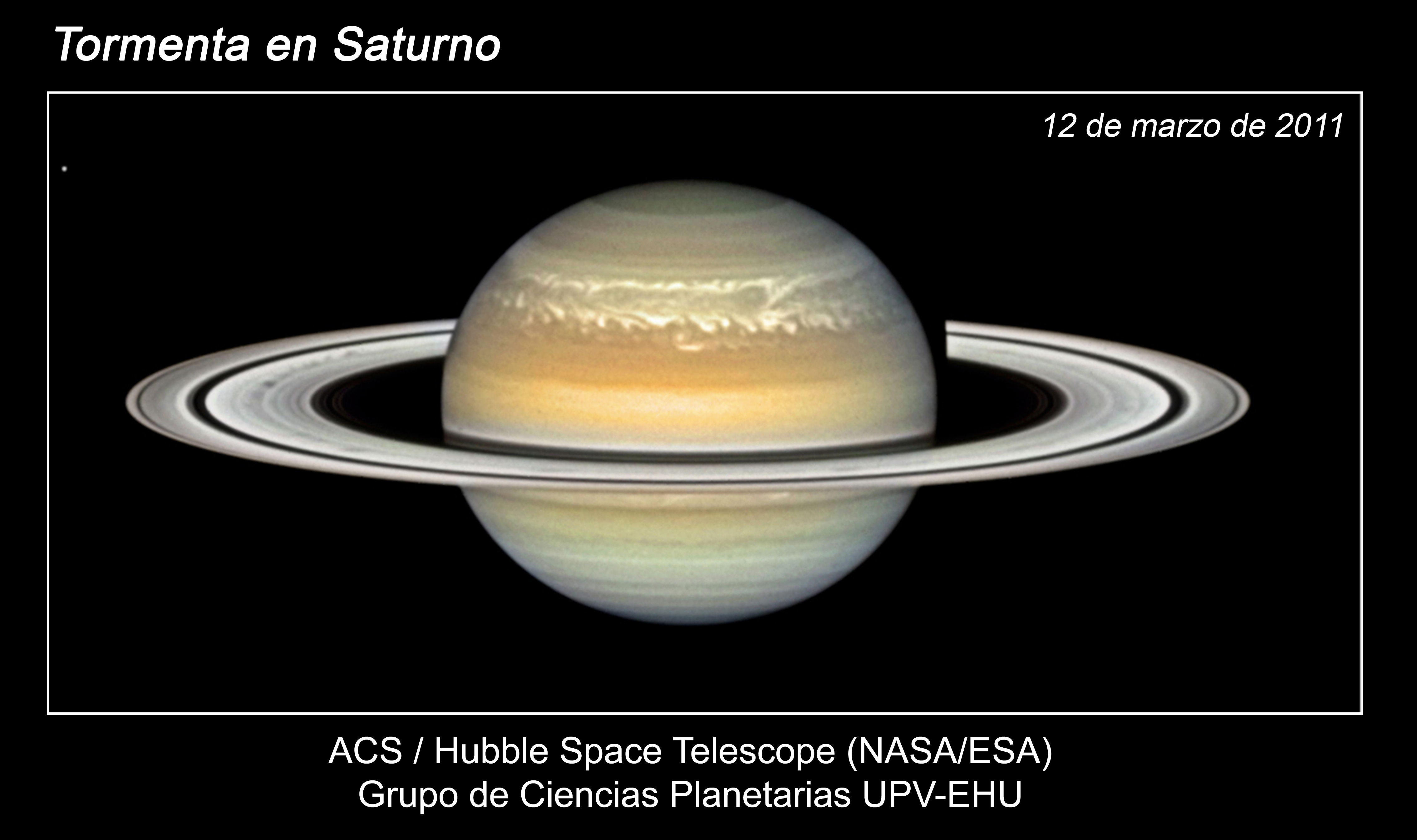 La tormenta en Saturno, en una imagen tomada con el telescopio espacial Hubble el 12 de marzo de 2011. (1.75 MB)