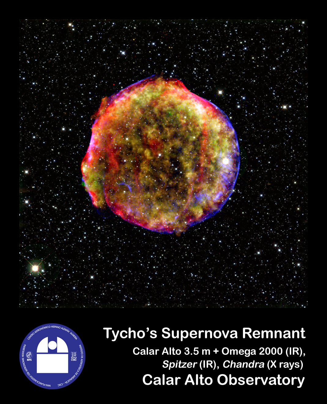 Multi-band image of the remnant of Tycho's Supernova, composed from images taken with the 3.5 m telescope of Calar Alto and the camera Omega 2000 (infrared), the Spitzer space telescope (infrared) and the Chandra space telescope (X-rays).