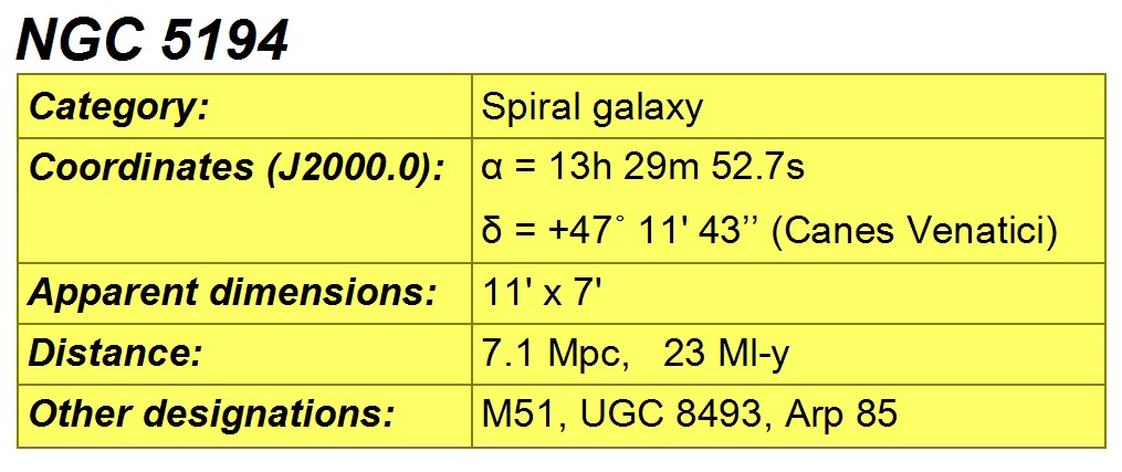Galaxy M51 was discovered by Charles Messier in 1773, but its outstanding spiral structure was first perceived by William Parsons (Earl of Rosse) in 1845, using his huge reflecting telescope, the Leviathan of Parsonstown. A large telescope is needed to see its intricate shape, but even small amateur telescopes reveal that this galaxy is not isolated, but has a small companion, the dwarf irregular galaxy NGC 5195.