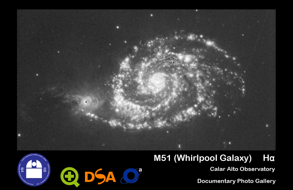 H-alpha monochromatic image of M51 and NGC 5195, in Canes Venatici, from the Documentary Photo Gallery of Calar Alto Observatory (CAHA-Descubre-DSA). 11 hours of integration through the Zeiss 1.23 m telescope of Calar Alto Observatory equipped with a research-grade CCD camera and a Baader Planetarium interferometric H-alpha filter (7 nm passband). The continuum emission in the red band has ben subrected from this image to highlight the regions dominated by ionised hydrogen. North left, East down. Credits: CAHA, Descubre, DSA, OAUV. Vicent Peris (OAUV/DSA/PixInsight), Jack Harvey (SSRO/DSA), Steven Mazlin (SSRO/DSA), Carlos Sonnenstein (Valkànik/DSA) and Juan Conejero (PixInsight/DSA). (Compressed JPEG, 343 kB.)