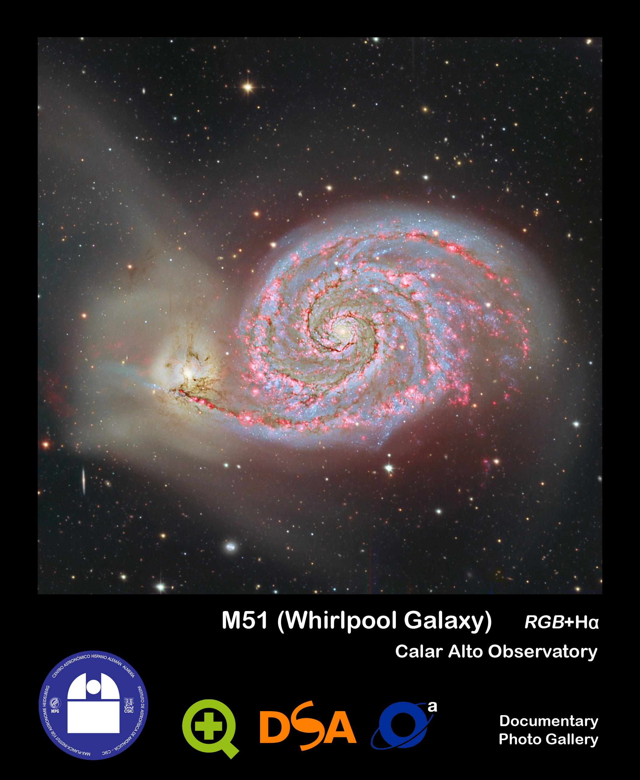 H-alpha enhanced colour image of M51 and NGC 5195, in Canes Venatici, from the Documentary Photo Gallery of Calar Alto Observatory (CAHA-Descubre-DSA). 35 hours of integration through the Zeiss 1.23 m telescope of Calar Alto Observatory equipped with a research-grade CCD camera and a set of photographic RGB filters by Baader Planetarium (24 hours), and a Baader Planetarium interferometric H-alpha filter (7 nm passband, 11 additional hours). The H-alpha emission in this image has been enhanced by a factor 4, to highlight the star-forming regions in the disk of M51 and other HII extensions around NGC 5195. Field of view of 15 arcminutes (one quarter of the apparent width of the full Moon). North left, East down. Credits: CAHA, Descubre, DSA, OAUV. Vicent Peris (OAUV/DSA/PixInsight), Jack Harvey (SSRO/DSA), Steven Mazlin (SSRO/DSA), Carlos Sonnenstein (Valkànik/DSA) and Juan Conejero (PixInsight/DSA). (Compressed JPEG, 2.4 MB.)