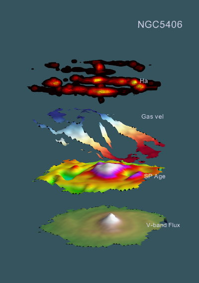 An example of the scientific results that can be obtained from CALIFA data: A stack of maps of one galaxy (NGC 5406) displaying the spatial distribution of several properties; from top down: emission from ionized hydrogen, velocity of the gas inside the galaxy, estimated age of the stellar population, brightness in the visual band.