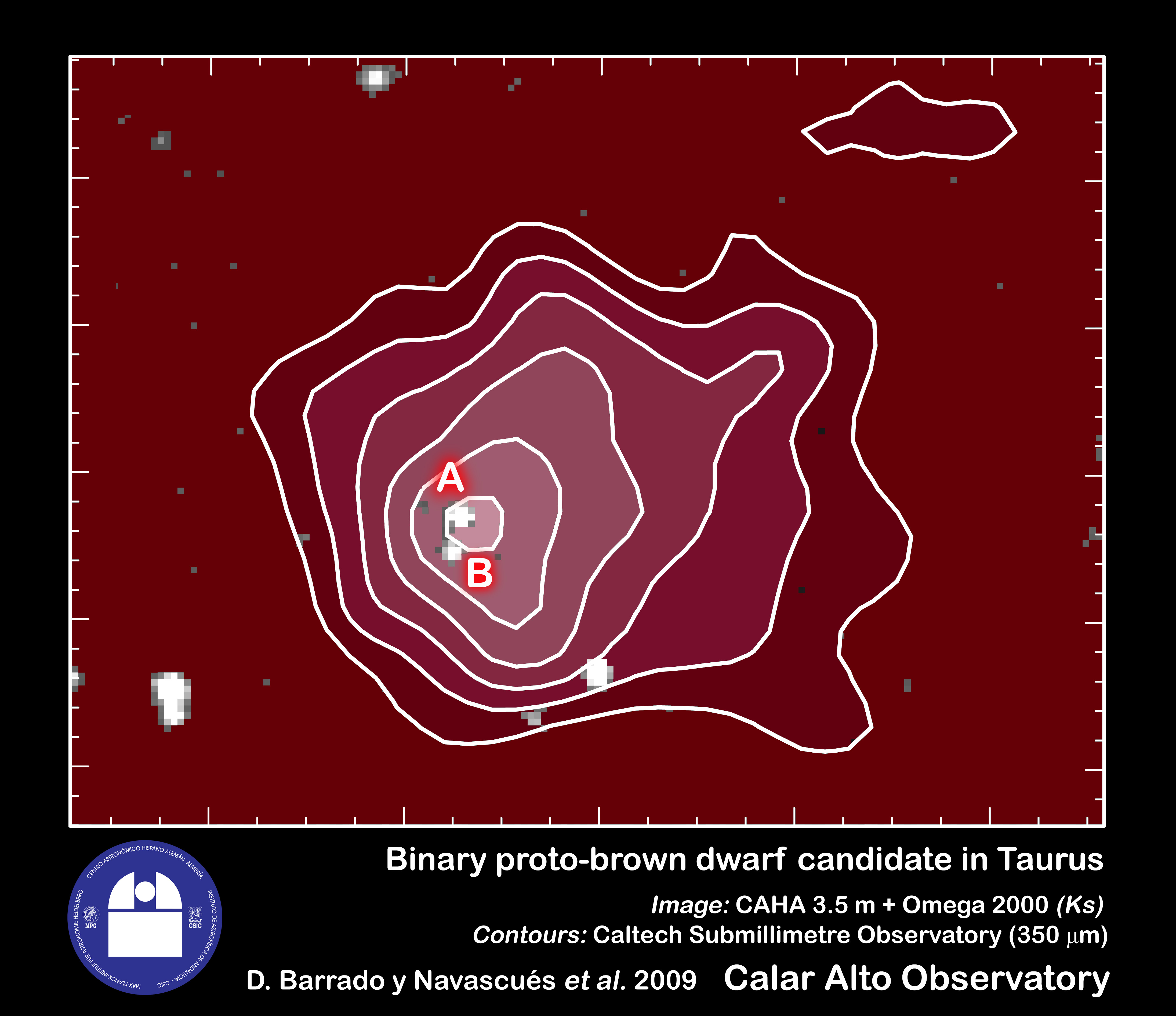 The multi-band analysis was carried out retrieving data from public data bases and, also, making new observations at different observatories. Spitzer, 2MASS and CFHT archive data were used, and observing campaigns were performed with the IRAM 30 m radiotelescope (Granada, Spain), ESO's Very Large Telescope (Chile), Caltech Submillimetre Observatory (Hawaii, USA), Very Large Array (New Mexico, USA) and Calar Alto Observatory (Almería, Spain). Calar Alto data were obtained in 2007 with the Zeiss 3.5 m telescope equipped with Omega 2000 infrared camera. According to the researchers "CAHA data were key to confirm the nature of the object," by providing near-infrared high spatial resolution imaging, that turned out to be the best proto-brown dwarf candidate yet known.
