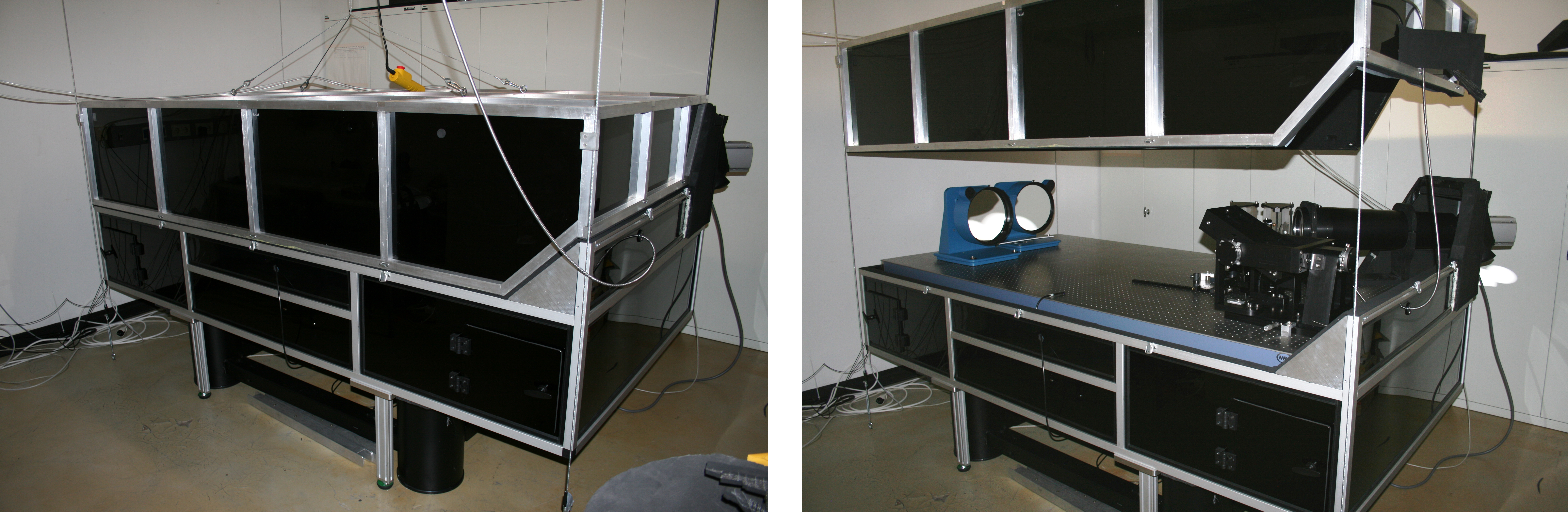 | CAFÉ spectrograph housed inside its stabilised room, covered (left) and not covered (right) with the removeable cabinet that ensures its termal stability