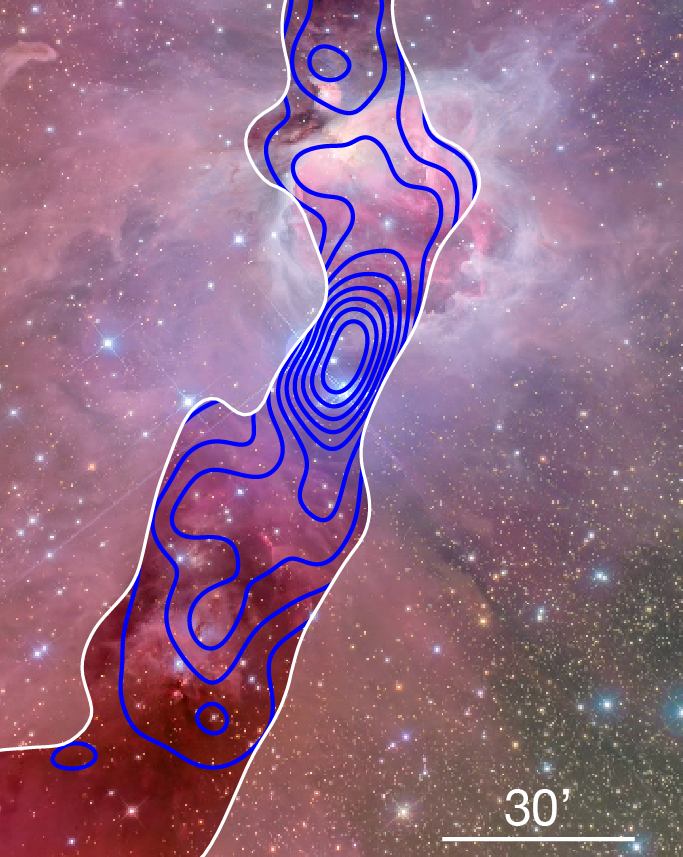 Density of stars in front of the cloud. The shaded area represents the thinnest part of the molecular cloud. A clustering is clearly visible centred on iota Orionis. Credit for the photograph: Jon Christensen.