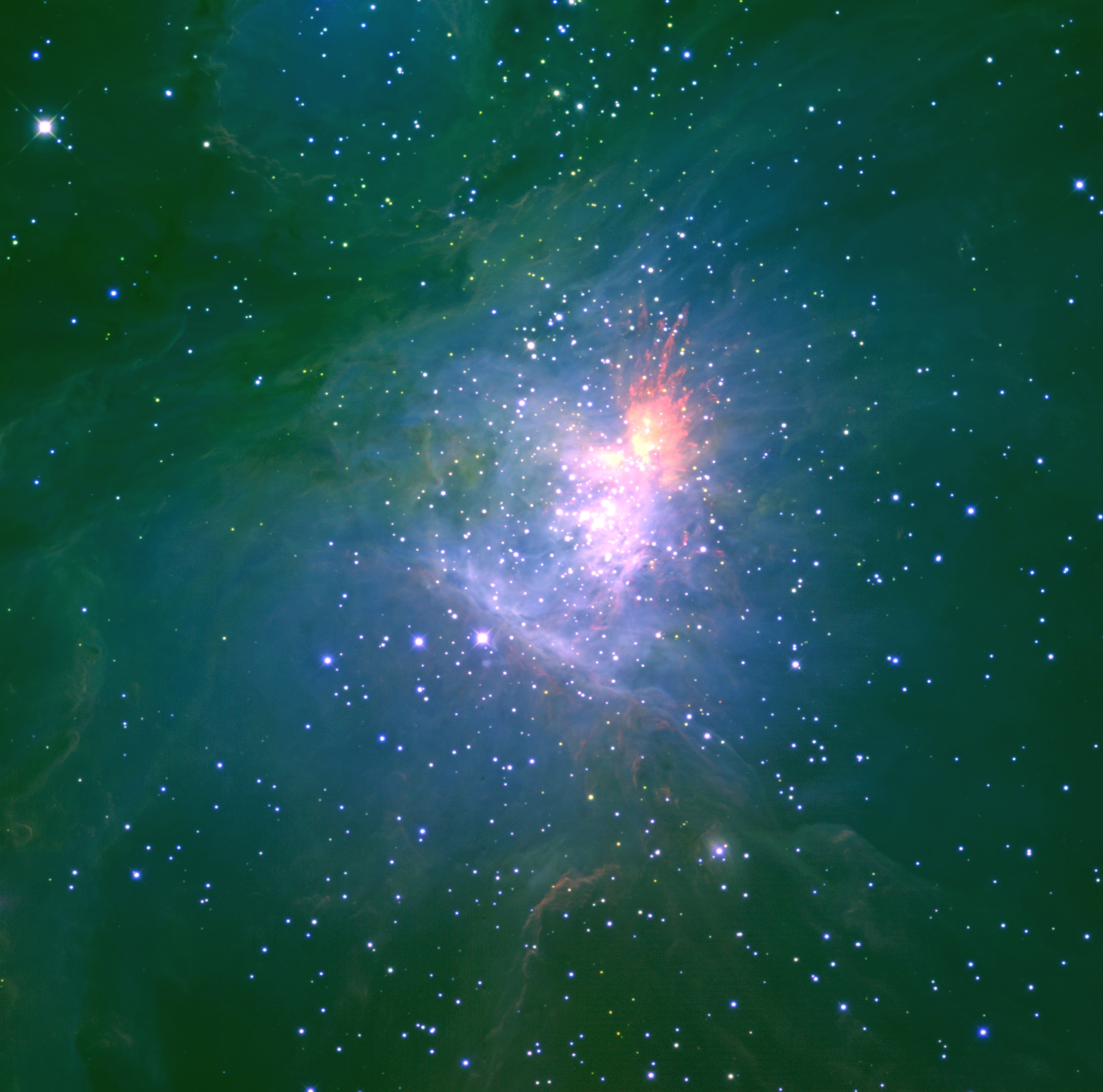 teaser smallThe Orion nebula (also known as M42) is one of the great wonders of the night sky. Its discovery goes back 400 years, when it first appeared described as "fog" in the observing logs of French astronomer Nicolas-Claude Fabri de Peiresc (1610). The discovery of the Orion nebula is intimately associated with the early developments of the telescope, but only in the last 60 years have we come to realize the true astrophysical importance of this glamorous object: the nebula, like so many in our Galaxy and in other galaxies, is a nursery of baby stars. Inside the Orion nebula astronomers have found a wide range of young stellar and stellar-like objects, from massive ionizing stars tens of times more massive than the Sun, down to objects known as brown dwarfs, which are not massive enough to burn hydrogen and become true stars. Of all the massive nurseries in our Galaxy, the Orion nebula is the closest to Earth. This makes this region special, offering astronomers the best chance to understand how nature transforms clouds of very diffuse gas into hydrogen burning suns, failed stars, and eventually planets.