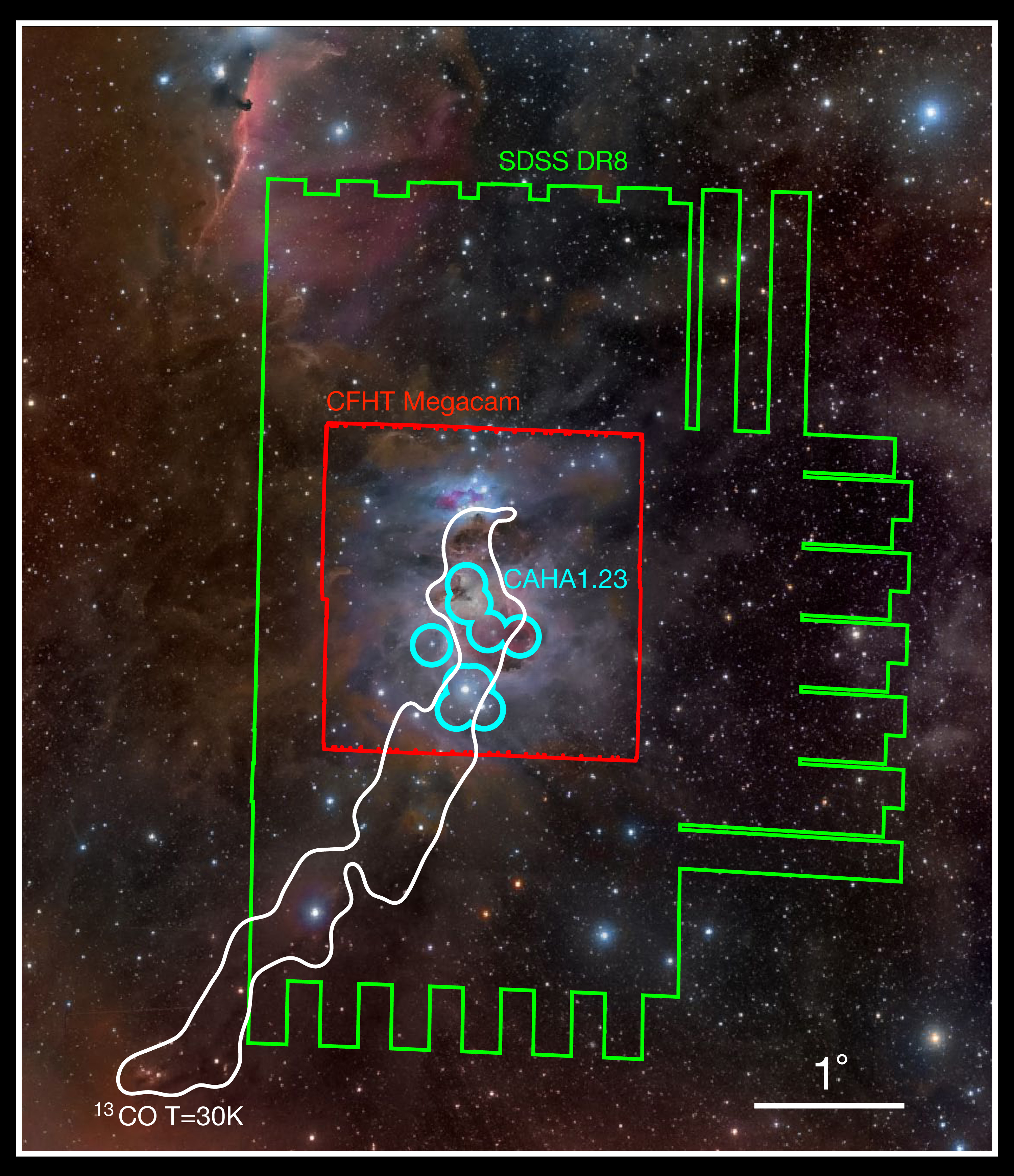 The Orion constellation with the footprints of the observations overplotted. The Calar Alto 1.23m images nicely complemented the other datasets in the vicinity of bright massive stars, and were key to the success of this study. Credit for the background photograph: Rogelio Bernal Andreo.(1.8 MB.)